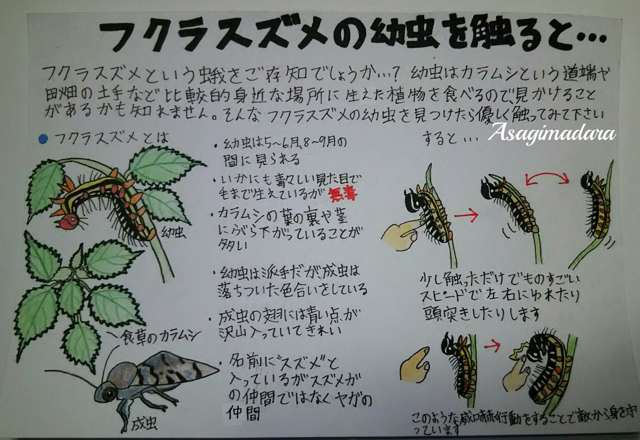 フクラスズメ(幼虫) こんにちは! 日東防疫です。 先日、お得意先で毛虫がたまに室内へ侵入するとの事で写真を見せてもらいました。 頭がオレンジで体の側面は白く赤い斑点があり、派手な虫でした。 家の裏にはイラクサ科の植物が沢山あり、これ. →フクラスズメ 幼虫の威嚇行動(YouTube) これ、静止画では伝わらないので、よかったらYouTubeで確認してください。30秒にまとめてみました。 その激しさにびっくりですよ!! すご技3 液体を吐き出す!. フクラスズメ 褐色地に黒褐色の模様があるガ。 雑木林に多く見られる普通種。 夜、樹液に集まる。 成虫で越冬する。 幼虫は、イラクサ、カラムシなどの葉を食べる。 イラクサにいたフクラスズメの幼虫。 敵の気配を察すると激しく体を揺する習性.