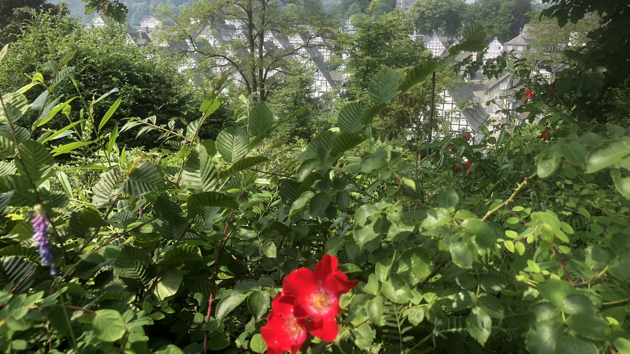 ドイツ幻想風景 白と黒の絶景の街フロイデンベルクの丘には 赤やピンクの野バラが咲き乱れ 白雪姫が迷いこんだ森のよう 薔薇の咲く人通りのない街並みは まるで眠りにつくイバラ姫の城 グリム童話の世界のような白黒の街にも 鮮やかな薔薇の季節が