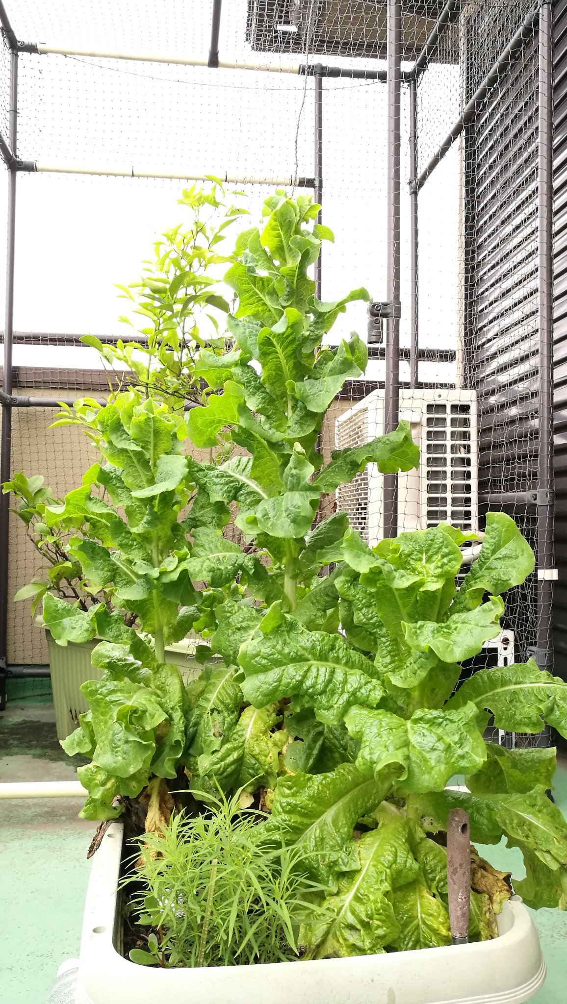 サンチュの収穫と撤収と まりちゃんのベランダ水耕栽培