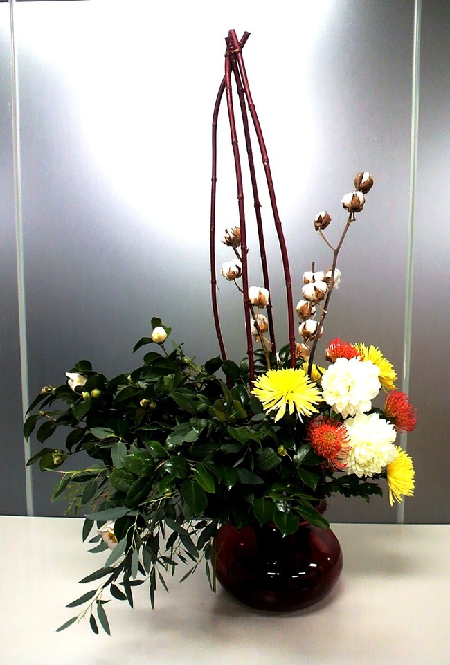 サンゴミズキ ゴット キク 生花 丁寧に曲げた 池坊 花のあけちゃんブログ明田眞子 花の力は素晴らしい 広島で40年 池坊いけばな教室 熱心な方々と楽しく生けてます