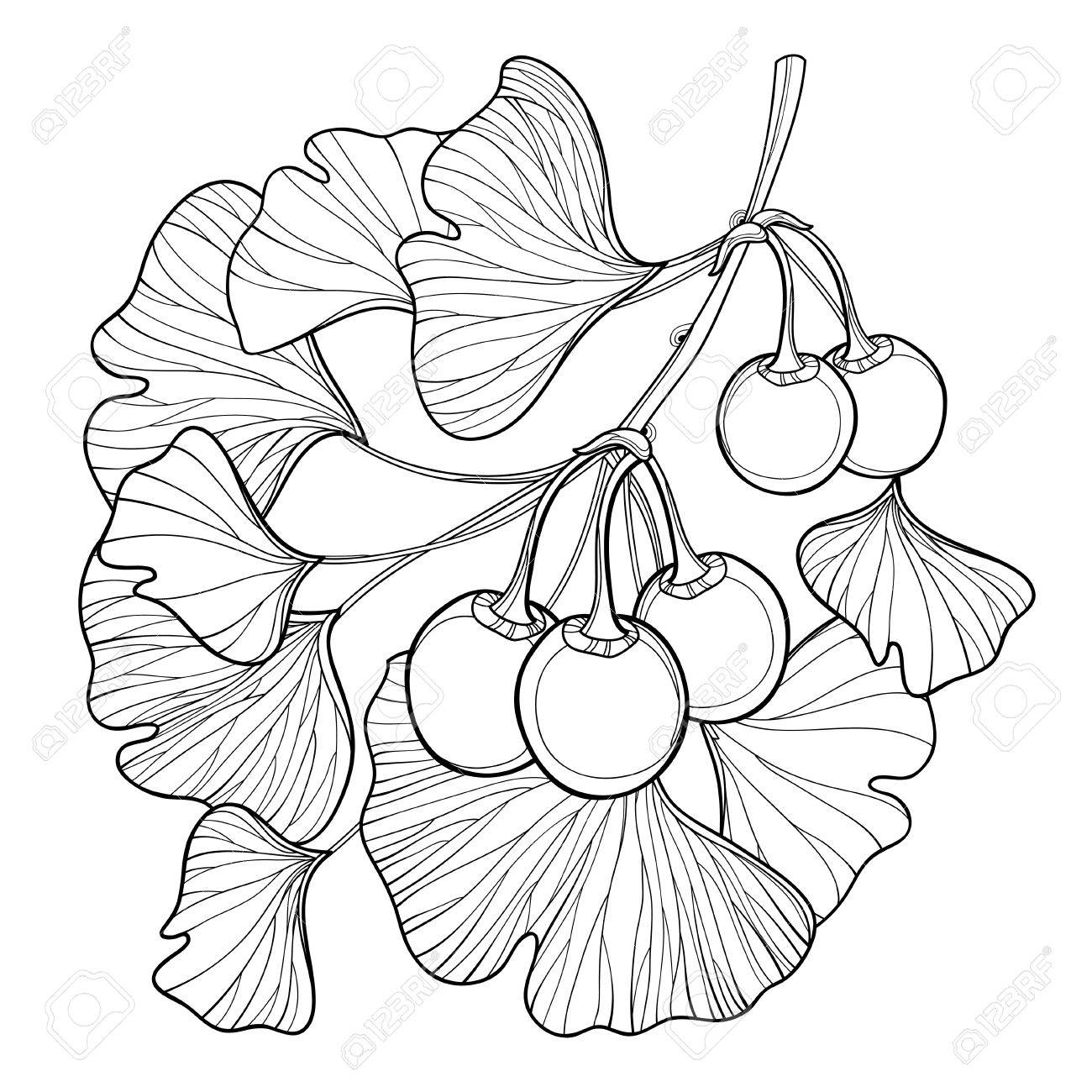 概要銀杏イチョウの木と分岐します 緑の葉と果実は 白い背景で隔離の束します エキゾチックな夏デザインの輪郭のスタイルで裸子植物遺存植物 のイラスト素材 ベクタ Image