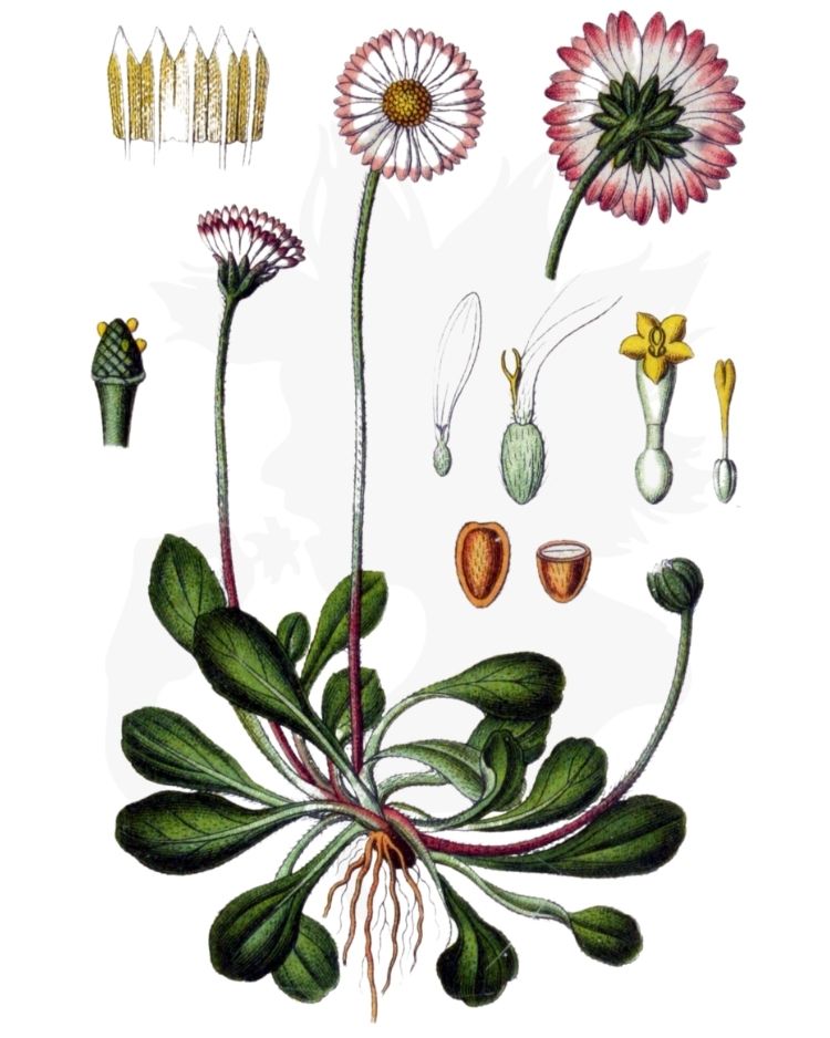 Bellis perennis has also been used traditionally for treating wounds Chewing the fresh leaves is said to be a cure for mouth ulcers In homeopathy, Bellis perennis is often used in combination with Arnica montana to treat bruising and trauma Common daisy is widely used in homeopathy, but is currently only rarely used in herbal medicine. Bellis perennis 'Pomponette' (English Daisy) is a perennial grown as a biennial, with a rosette of spoonshaped, dark green leaves, and masses of cute pomponlike, fully double flowers in shades of red, pink or white Blooming in spring and summer, they prefer cool weather, and often decline when hot weather arrives. Bellis perennis, which mean perennial beauty, is a perennial medicinal plant of the Asteraceae family The spoonshaped leaves form a basal rosette of dark green The flowerheads are surrounded by two rows of bracts and consists of white female flowers and yellow hermaphrodite florets The fruit is a flat achene without pappus The leaves are edible and the.
