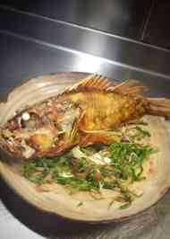 旨魚料理 オニの兜煮眞子肝胃袋添え まるかつ水産 旬の旨い魚を自前調達