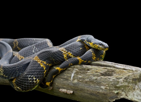 A フネガイのラットヘビ シマヘビ Schrenckii ログ上のクローズ アップ 黒に分離されました の写真素材 画像素材 Image