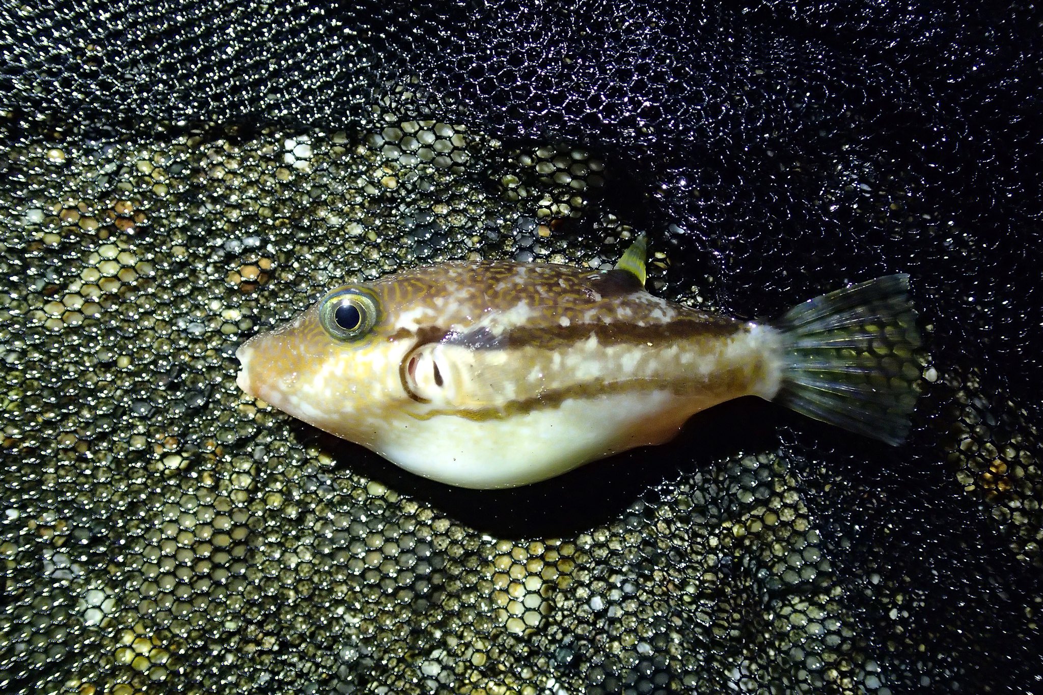 特に皮膚は強毒とされているが、毒性ではトラフグなどのほうが高い。 名前の由来 キタマクラ=『北枕』という名称は、死人を寝かせるときに北の方角に枕をむけることからきている。 毒性からすると他のフグ類のほうが強毒といえるが、クサフグ同様、沿岸部でかなり身近に釣れることから特に注意の意味をこめて名付けられたのかもしれない。 キタマクラとカワハギの違い 海釣. キタマクラCanthigaster rivulata (Temminck et Schlegel, 1847) 一般的なサイズ17cm キタマクラの基本情報や味・美味しさ、さばき方など掲載しています。. キタマクラ キタマクラ Canthigaster rivulata(フグ科キタマクラ属) 大きさ :~ cm 程度 生息環境 :岩礁帯 食べると北枕に寝かされる、即ち食べると死んでしまうというのが名前の由来。 やや突き出た吻が特徴の小型フグで、体側に2本の暗い縦縞がみられる。.