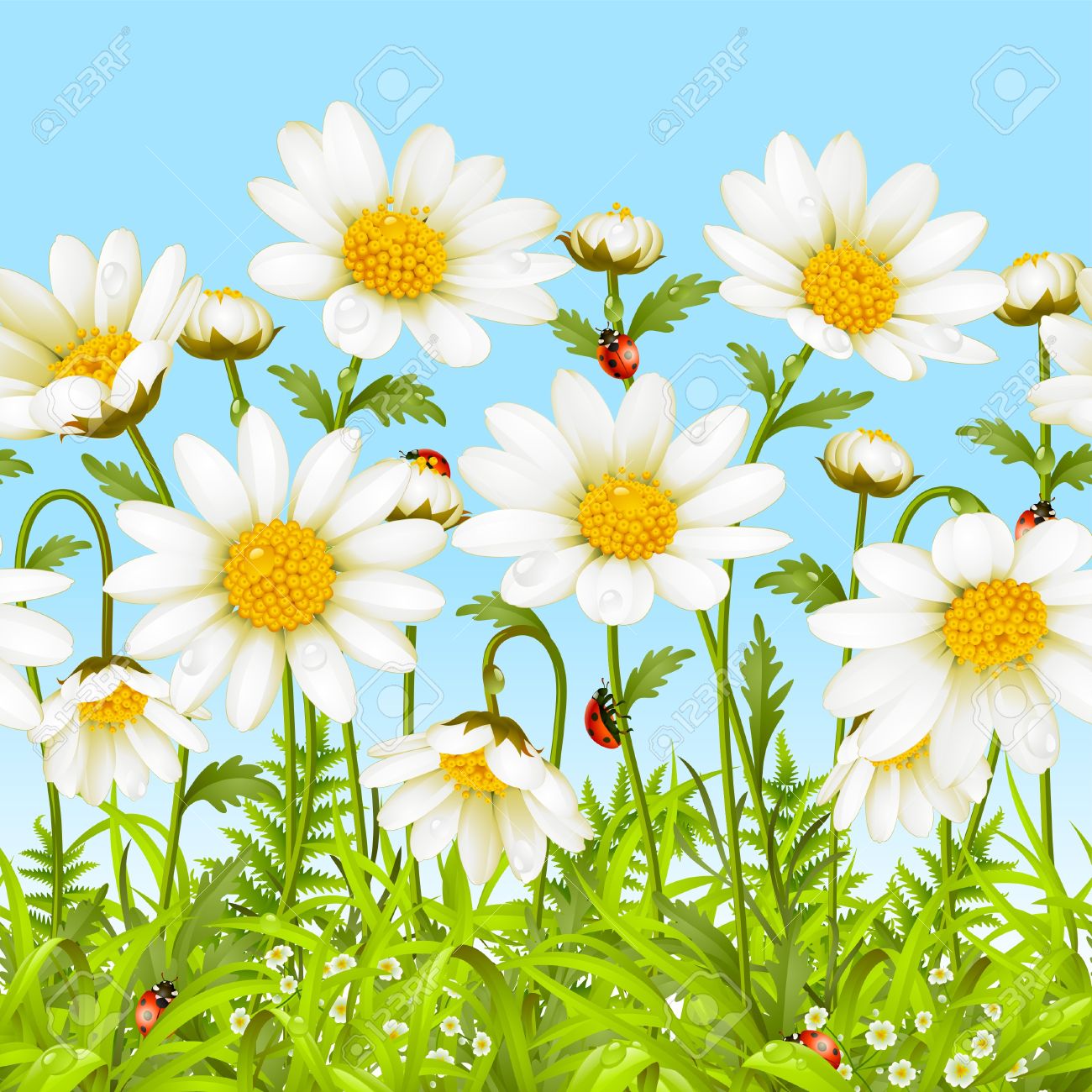 ベクトル カモミールとのシームレスな水平の背景 白い花と緑の芝生 のイラスト素材 ベクタ Image