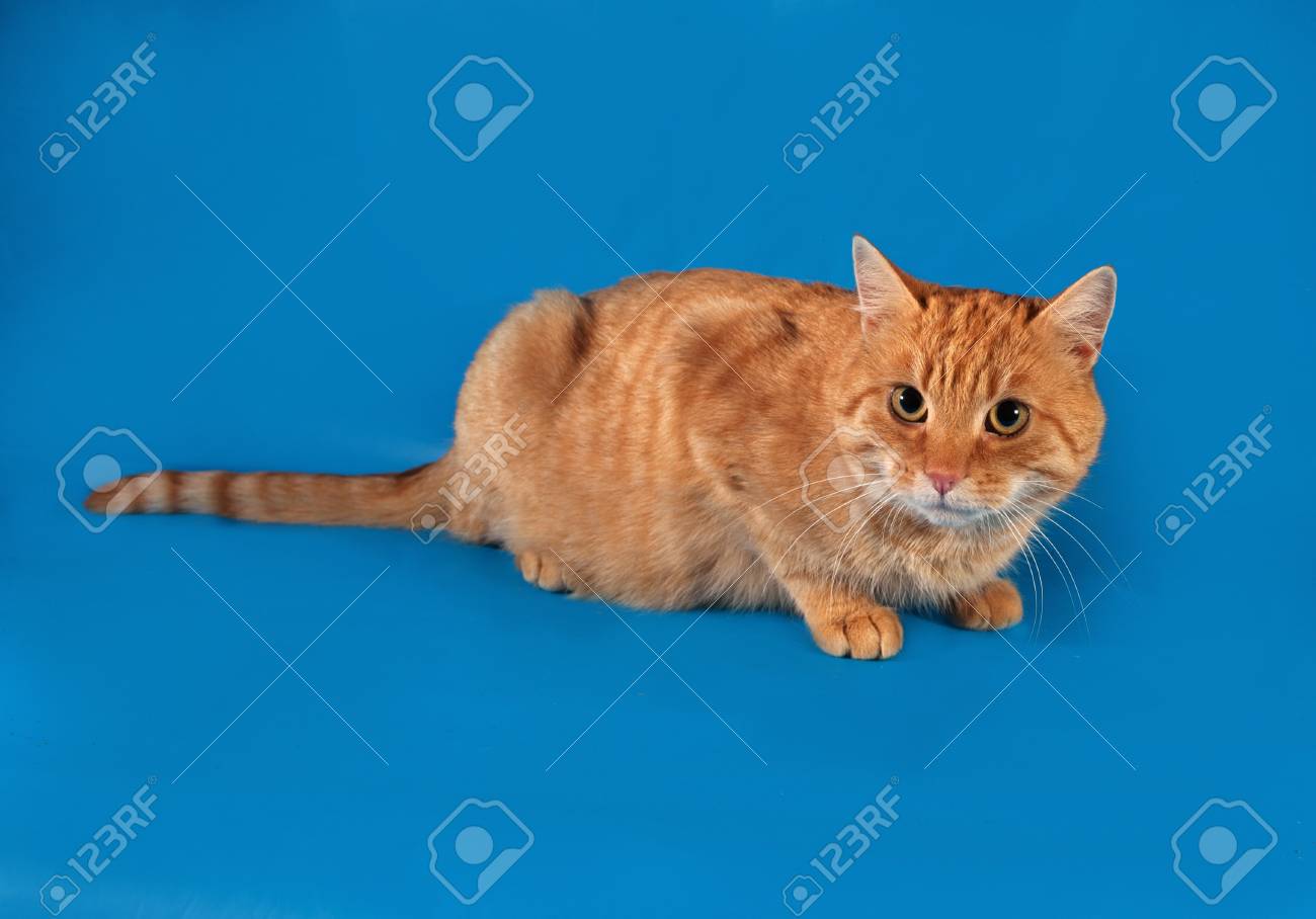 Ginger Tabby Cat Lying On Blue Background Canstock