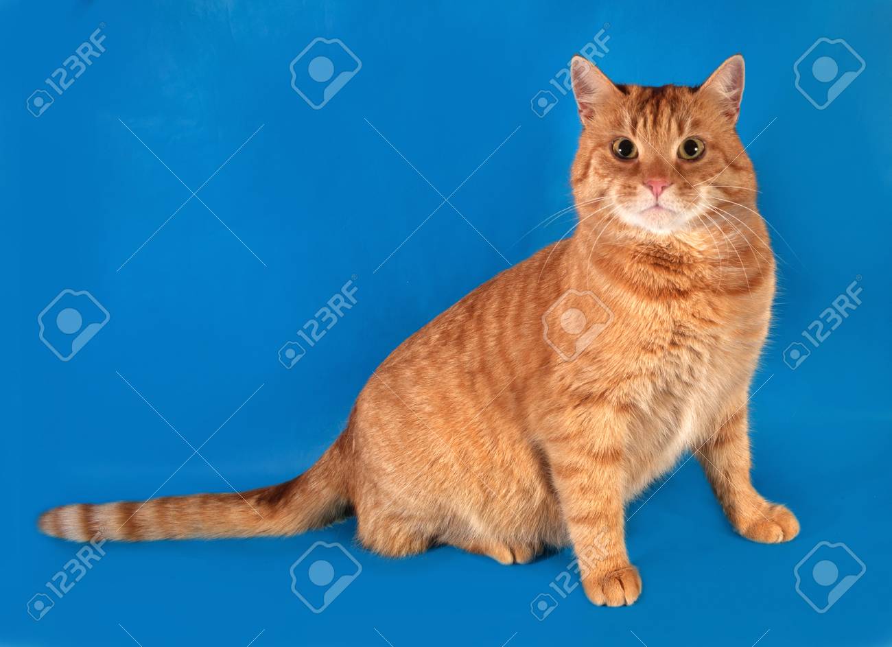 Ginger Tabby Cat Sitting On Blue Background Canstock