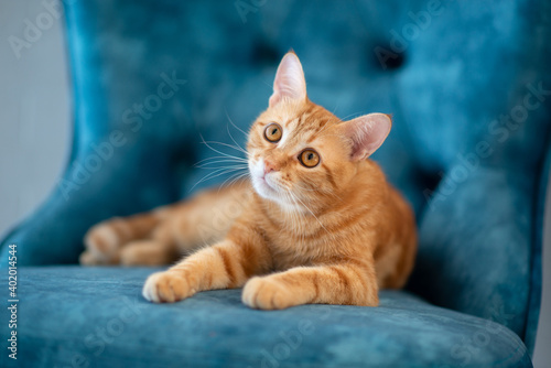 Beautiful Young Red Tabby Cat Lying On Blue Chair At Home Wall Mural Khorzhevska