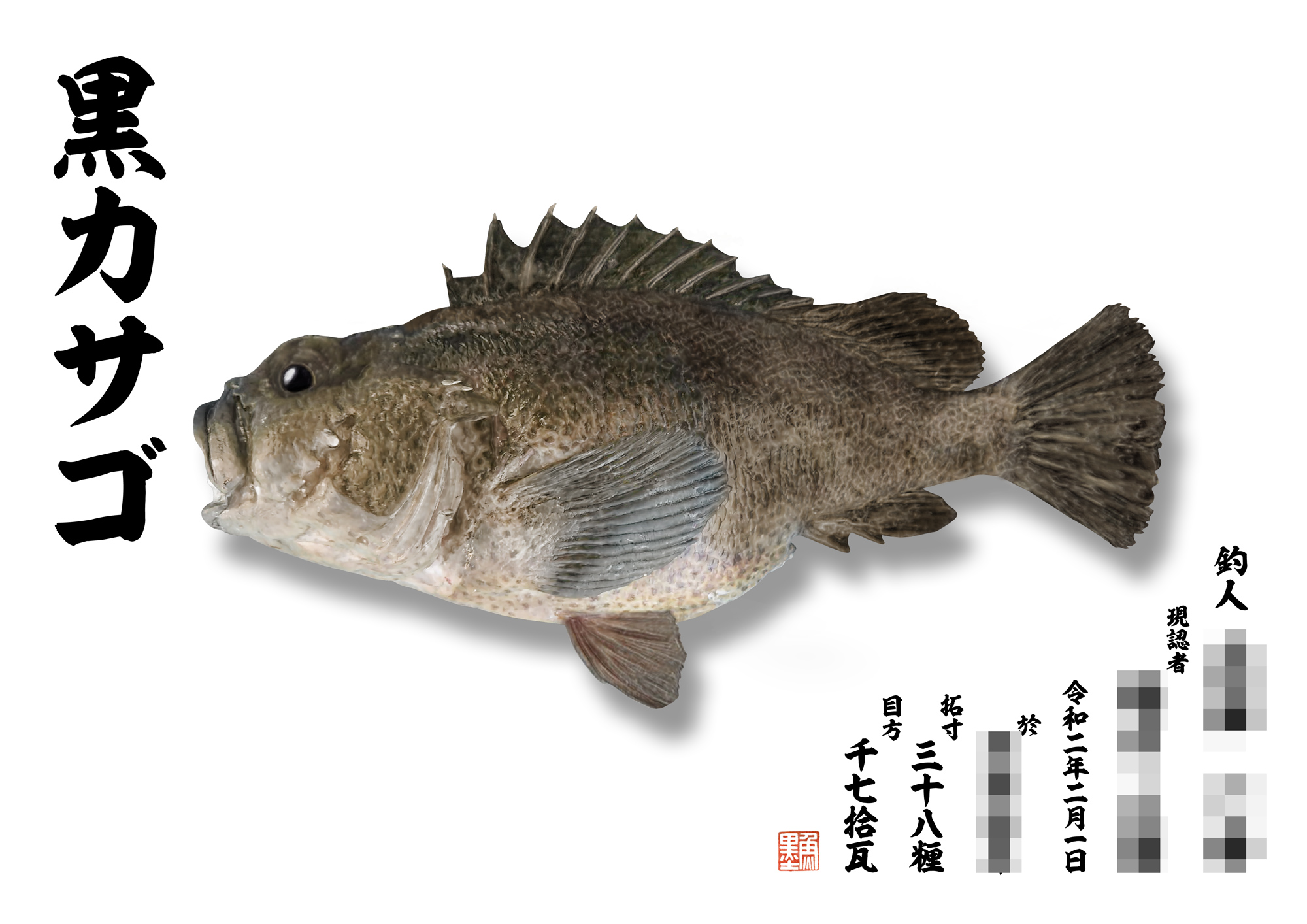デジタル魚拓 魚墨 何度もリピートしていただいている常連様から2作品同時にご注文いただきました 本日はそのうちの1作品をご紹介させていただきます リアル魚拓 黒カサゴ 38 お見事な釣果です 来週 もう1作品 黒鯛は 来週 ご紹介させて