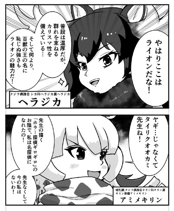 うさぺんぎん コミカライズ連載中 あなたヤギね 今日はけものフレンズにしてみました アミメキリンは中でも好きです 描いてて思ったのですが 雰囲気がりょくちゃんに結構似てるな と思いました おまけはケムリ フレンズの漫画です いかが