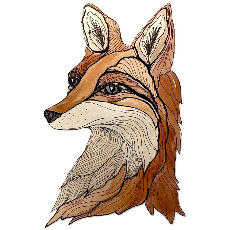Red Fox Face Watercolor And Black Line Art Original Etsy