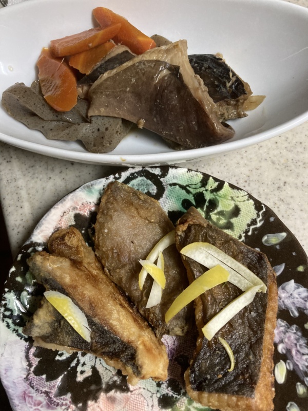 かすべの煮付け かすべ(エイヒレ)は1月によく食べた魚の一つで、先日も大好きな唐揚げにしたばかり。 その時はモーレツにお腹が減っていて写真を撮らなかったので、去年食べた画像はこちら。 →(0728 かすべの唐揚げ*芹と鶏肉の治部煮風.