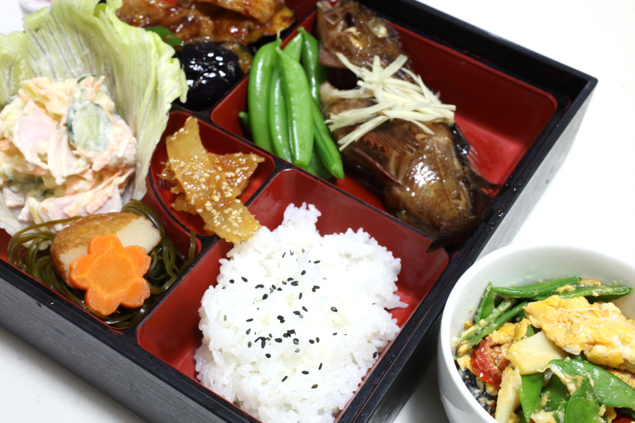金田産カサゴの煮付け ナスの肉みそ炒め マカロニサラダ 切り昆布とさつま揚げの煮物 絹さやとたけのこの卵とじ イカあられ 今日の弁当問題