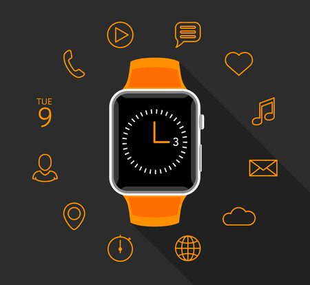 フラット グレーの背景に白のアプリのアイコンを持つモダンなオレンジ スマートウォッチ スマートな時計技術のベクター イラストです のイラスト素材 ベクタ Image