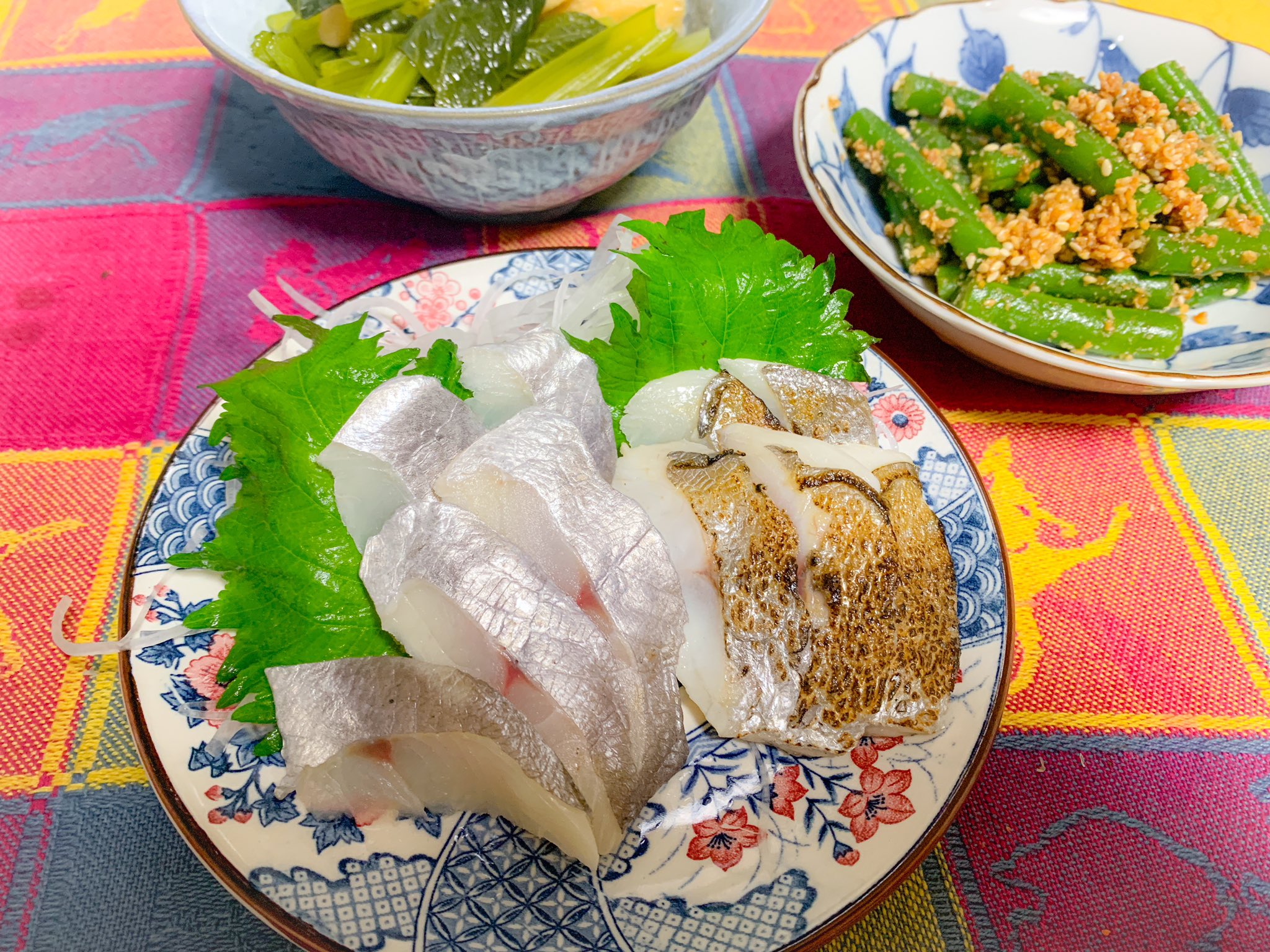 みほ イトヨリのお刺身 湯引き 真鯛とスズメ鯛の酒蒸し 真鯛の塩焼き イトヨリのアラのお味噌汁 イトヨリは皮に旨みがあり脂が乗っていて最高でした ๑ ㅂ ๑ 酒蒸しはポン酢と紅葉おろしと青葱で頂きました 美味しかったー Twitter家庭料理